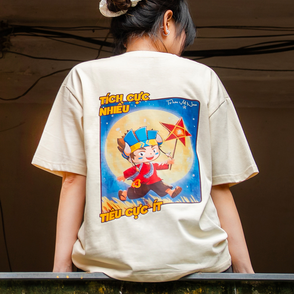Chiếc áo “Tích cực nhiều, tiêu cực ít” ra đời từ mong muốn lan tỏa một tinh thần sống lạc quan, nhẹ nhàng nhưng bền bỉ của người Việt, đặc biệt trong dịp sự kiện A80 – cột mốc gợi nhắc về niềm tin và hy vọng. Hình ảnh nhân vật hoạt hình mang sắc thái dân gian, tay cầm đèn ông sao, bước đi dưới ánh trăng tròn tượng trưng cho sự đủ đầy và niềm vui trọn vẹn. Thông điệp trên áo không mang tính giáo điều, mà gần gũi như một lời nhắc nhở giản dị: hãy giữ cho mình nhiều năng lượng tích cực hơn giữa cuộc sống nhiều biến động.