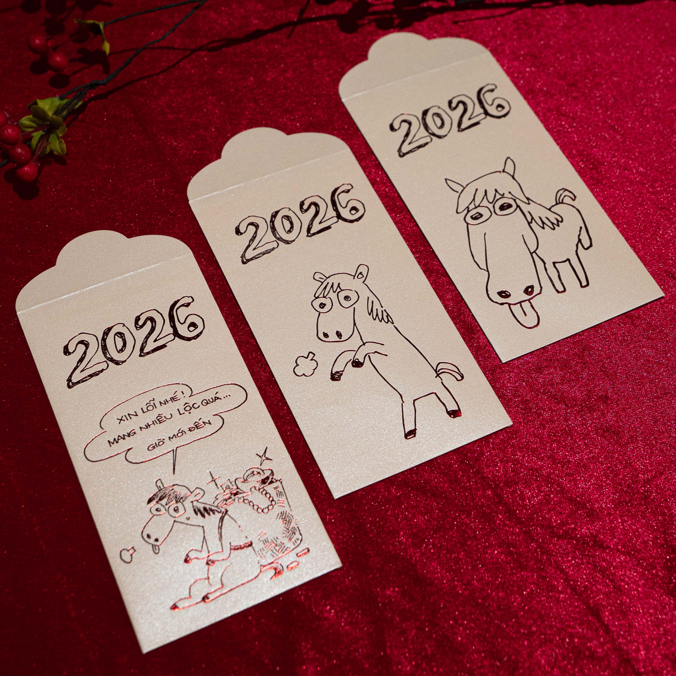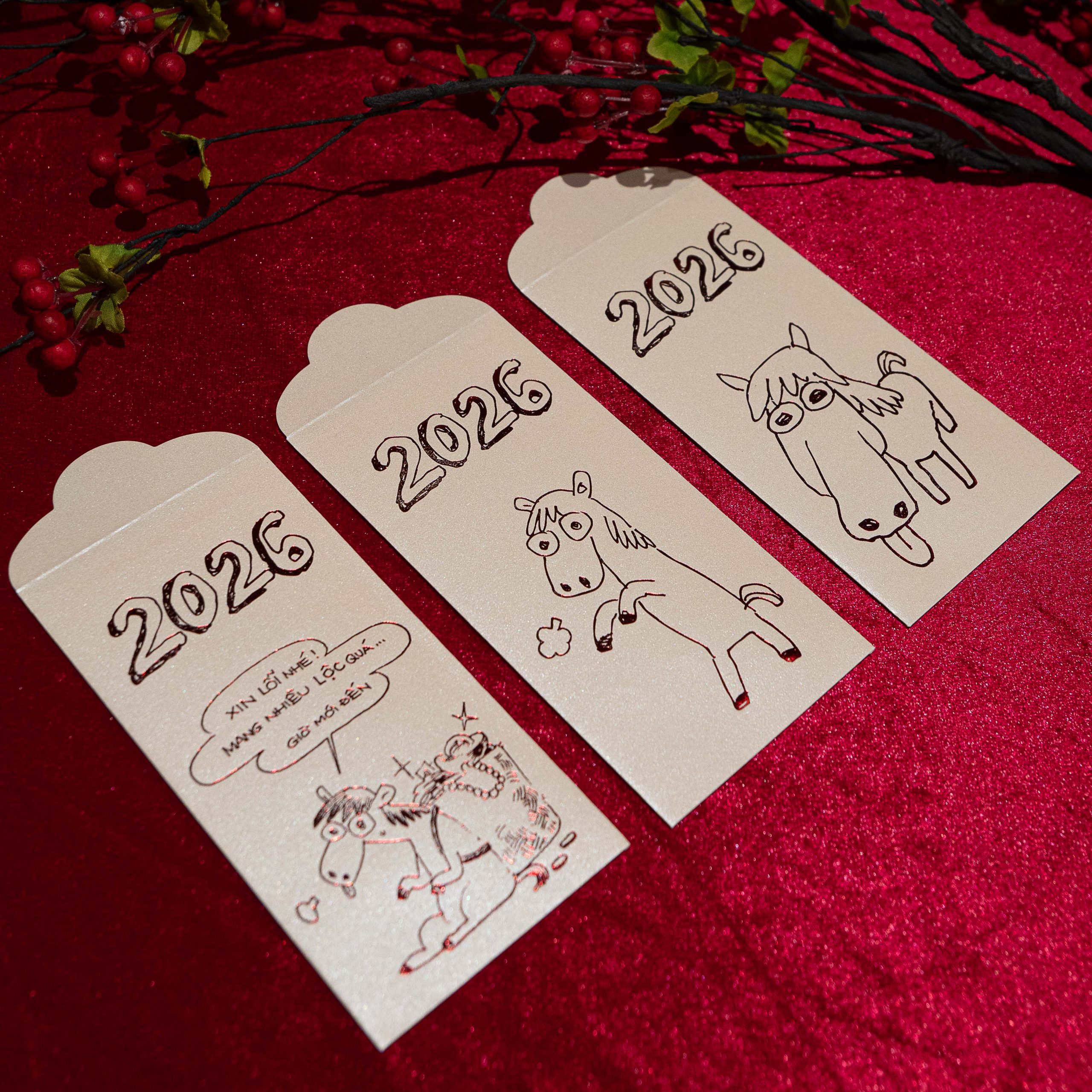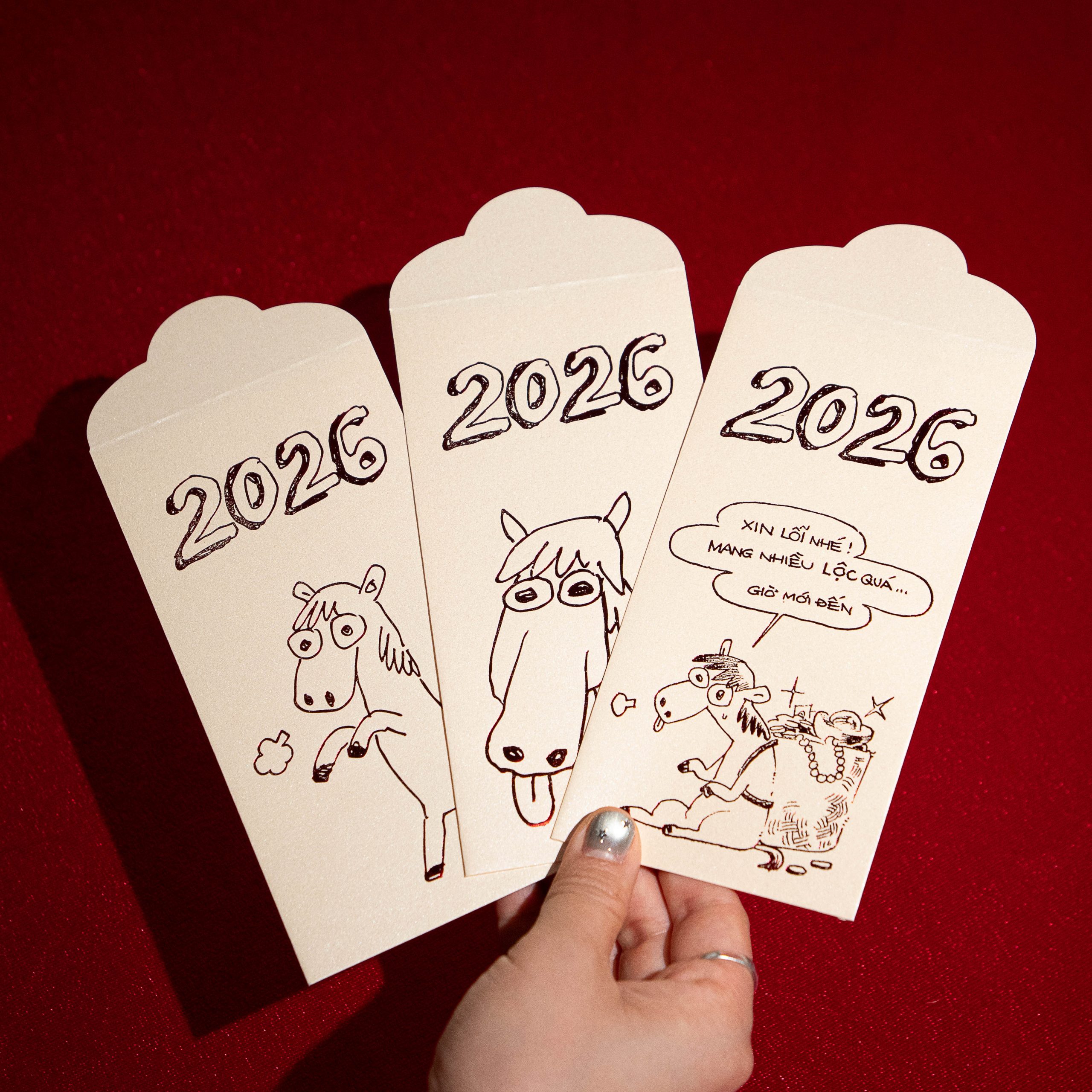 Lì xì “Hí Hí” là dòng sản phẩm đặc biệt trong bộ sưu tập Tết 2026, mang tinh thần vui nhộn và lời chúc may mắn đầu năm qua những nét vẽ ngựa hóm hỉnh. Sản phẩm sử dụng giấy ánh trai ép kim luxury, bề mặt lấp lánh sang trọng, phù hợp làm lì xì biếu tặng hoặc sưu tầm ngày Tết. Bộ Gồm 03 mẫu lì xì với nét vẽ cực kỳ nghiêm túc của họa sĩ Ếch Ộp cho năm Bính Ngọ 2026: “B lè”, “Hứng khởi” và “Ship lộc”