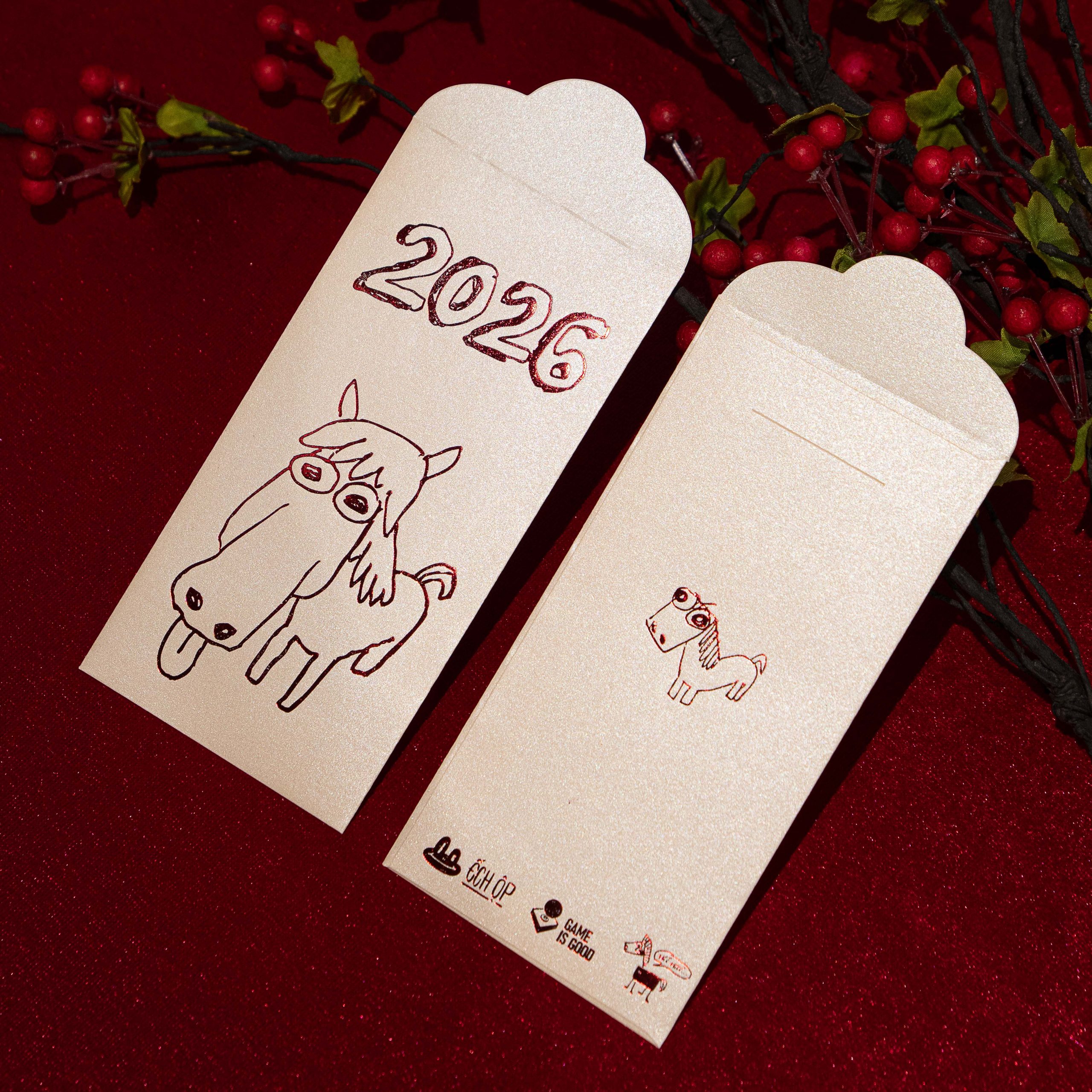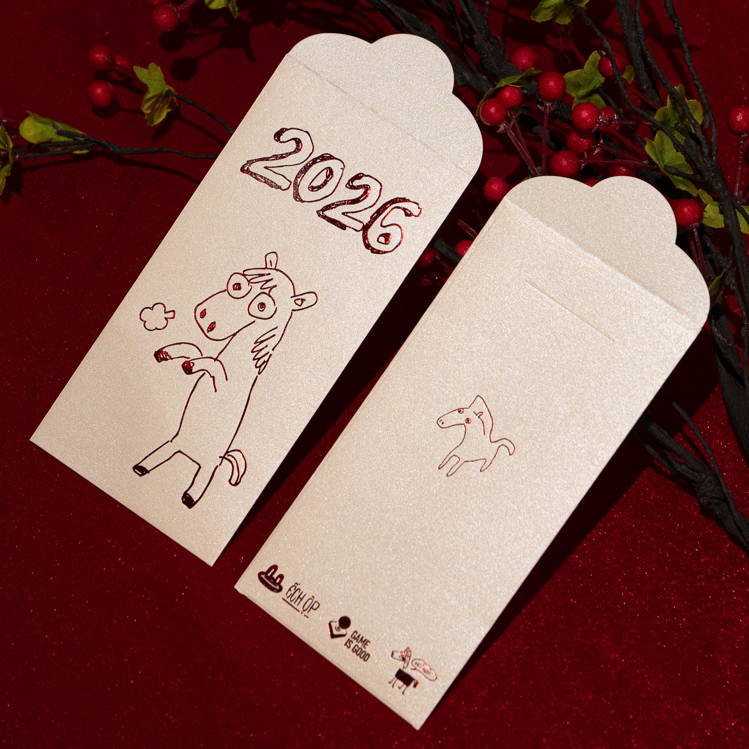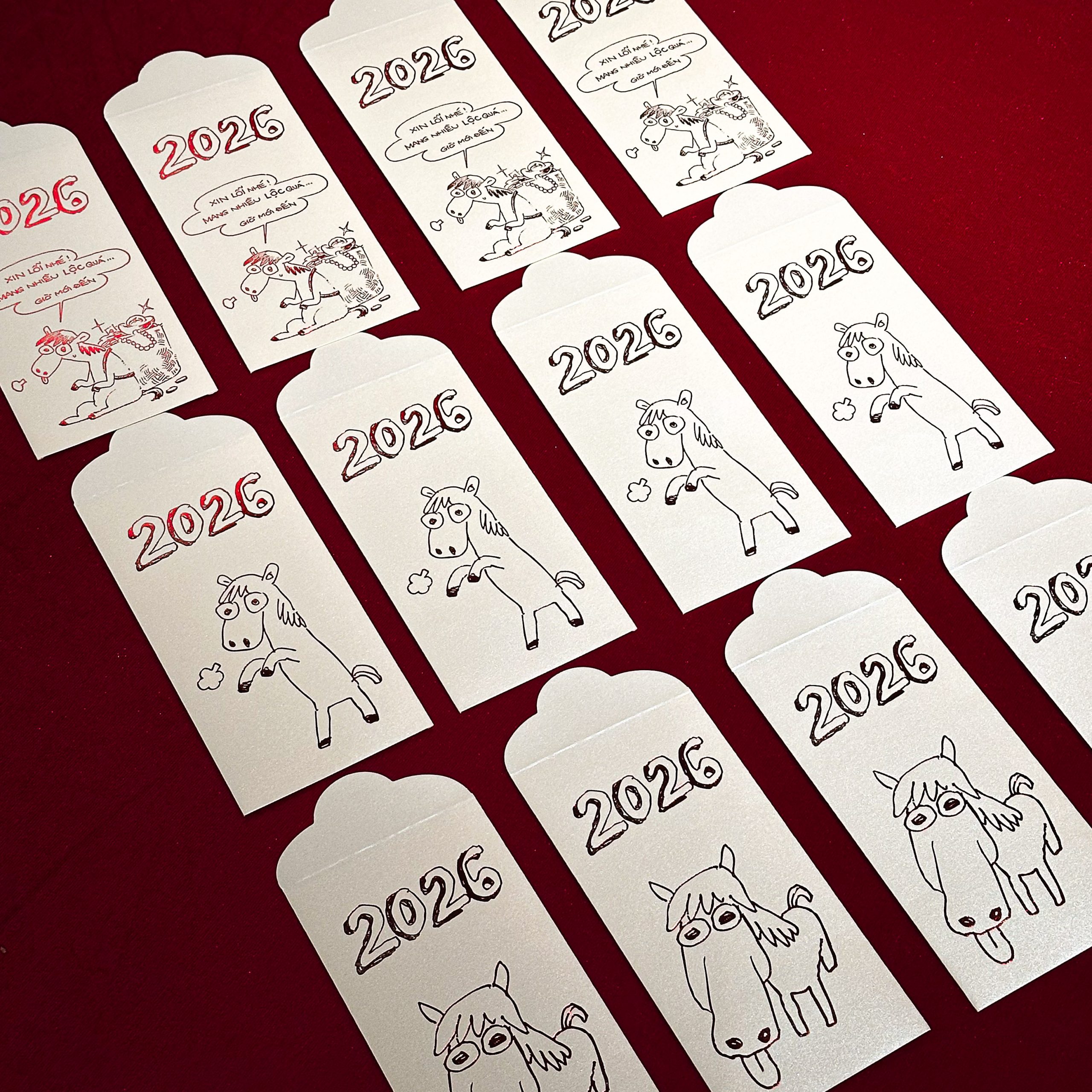 Lì xì “Hí Hí” là dòng sản phẩm đặc biệt trong bộ sưu tập Tết 2026, mang tinh thần vui nhộn và lời chúc may mắn đầu năm qua những nét vẽ ngựa hóm hỉnh. Sản phẩm sử dụng giấy ánh trai ép kim luxury, bề mặt lấp lánh sang trọng, phù hợp làm lì xì biếu tặng hoặc sưu tầm ngày Tết. Bộ Gồm 03 mẫu lì xì với nét vẽ cực kỳ nghiêm túc của họa sĩ Ếch Ộp cho năm Bính Ngọ 2026: “B lè”, “Hứng khởi” và “Ship lộc”